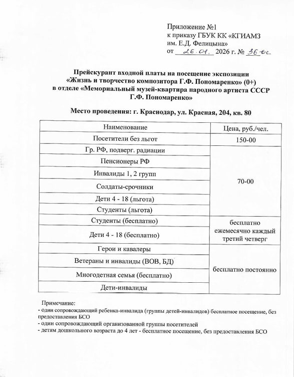 Мемориальный музей бережно сохраняет и популяризирует музыкальное наследие выдающегося советского композитора, народного артиста СССР Григория Фёдоровича Пономаренко. Знакомясь с экспозицией музея, посетители узнают о его жизненном и творческом пути, гастрольной деятельности. Прославивший в своих произведениях Россию и Кубань, Григорий Фёдорович был замечательным собеседником, любимым народом артистом, дружил с выдающимися людьми своего времени. Его песни исполняли народные артисты СССР Людмила Зыкина, Иосиф Кобзон, но высочайшее признание для автора это то, что их пел народ.