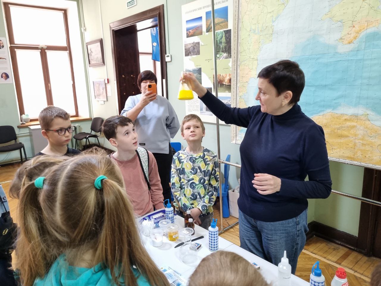 На интерактиве «В недрах планеты» юные гости познакомились со строением Земли, её слоями, минералами и горными породами, узнали об их свойствах и научились определять образцы самостоятельно.