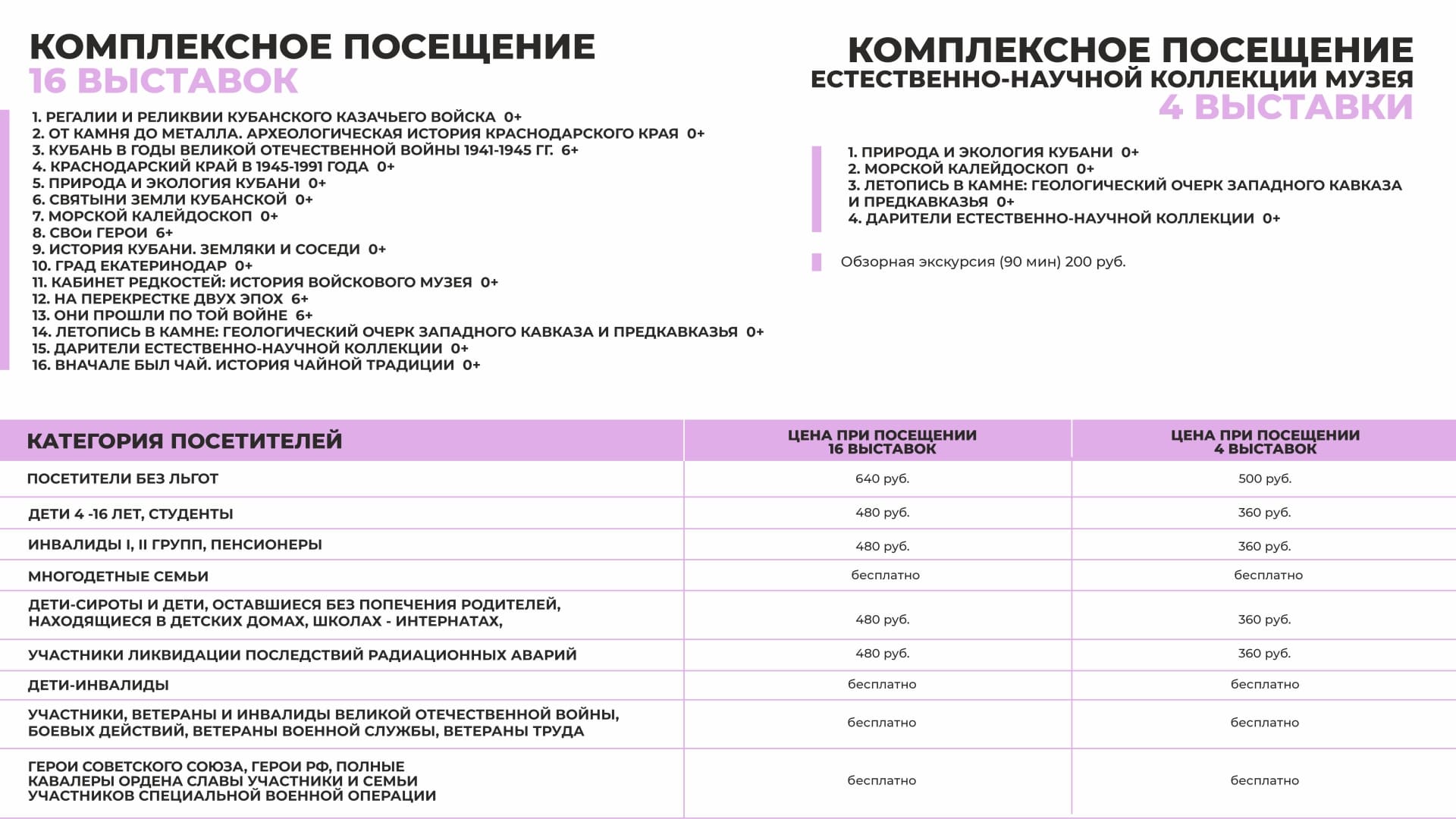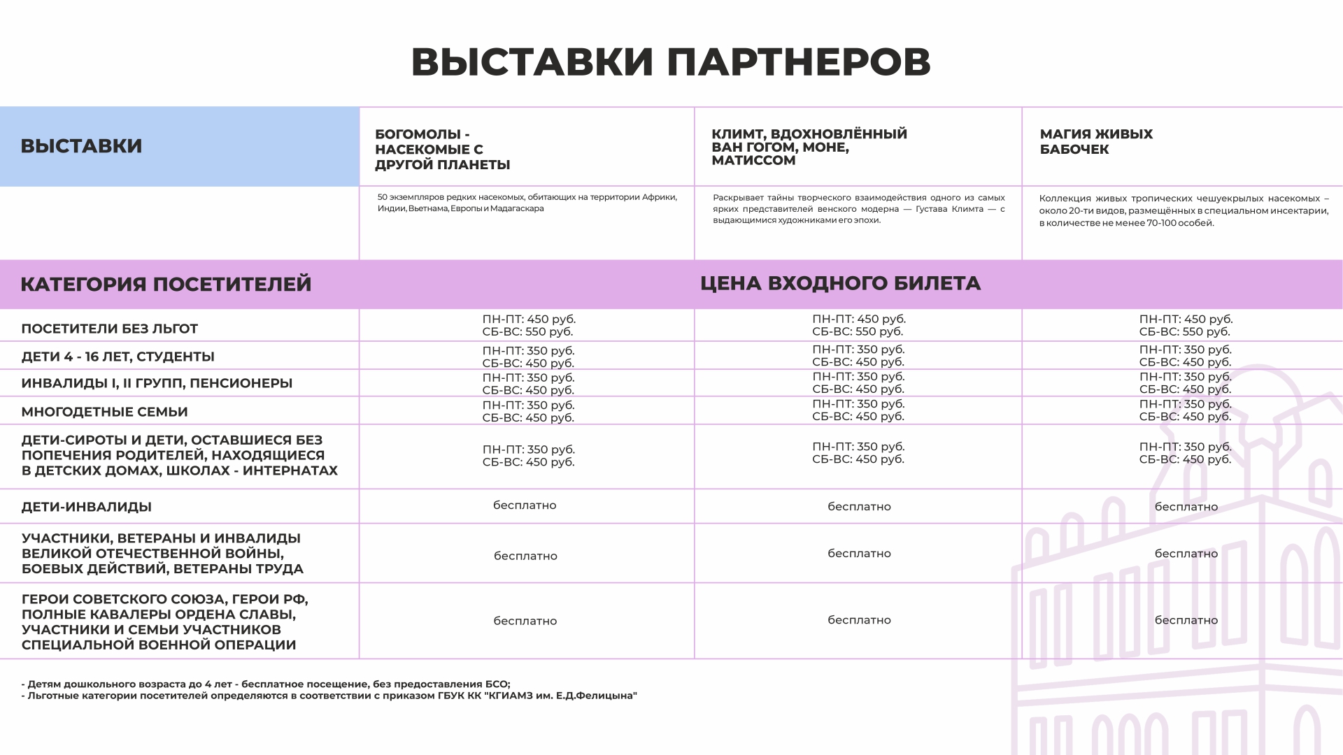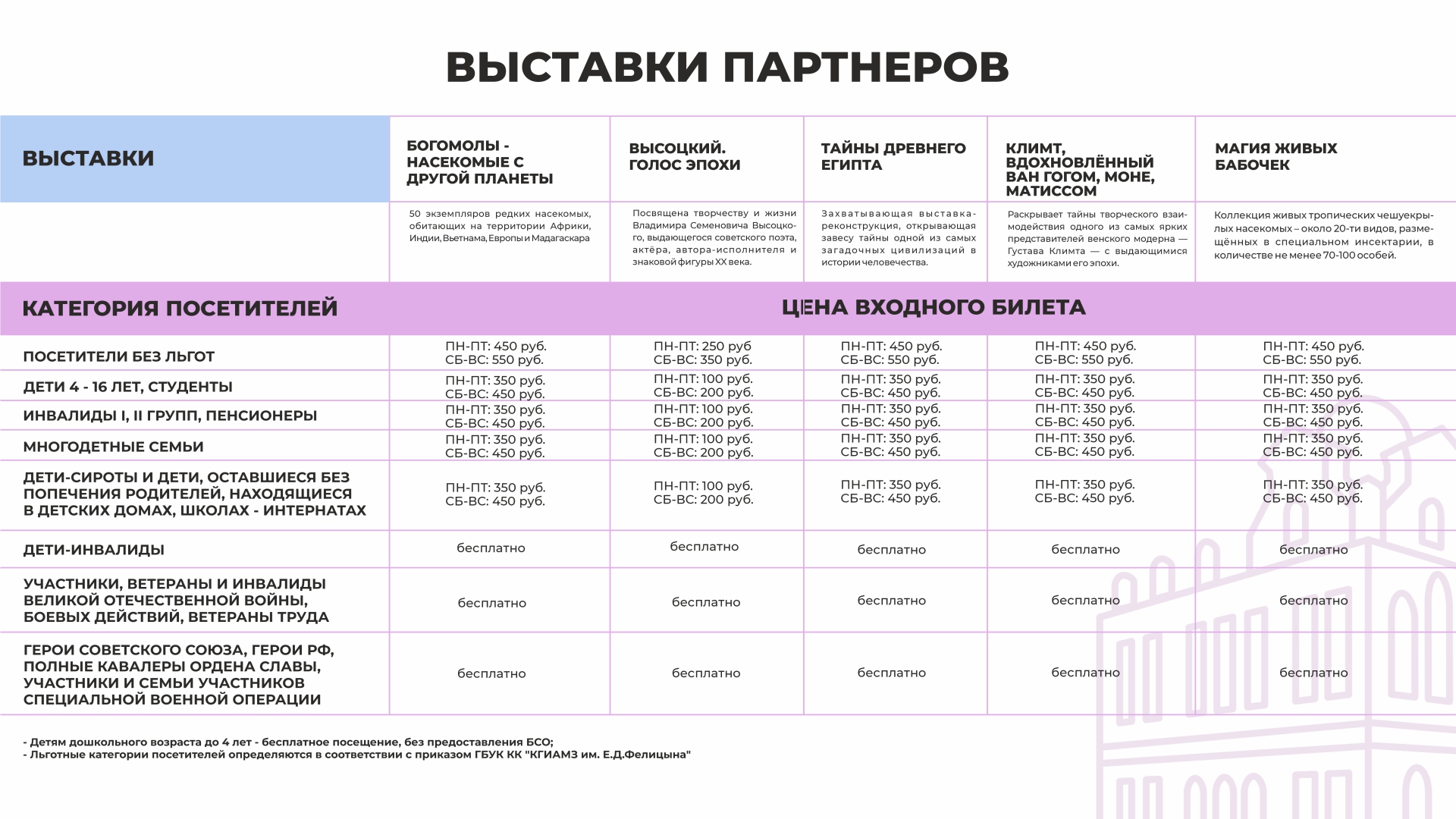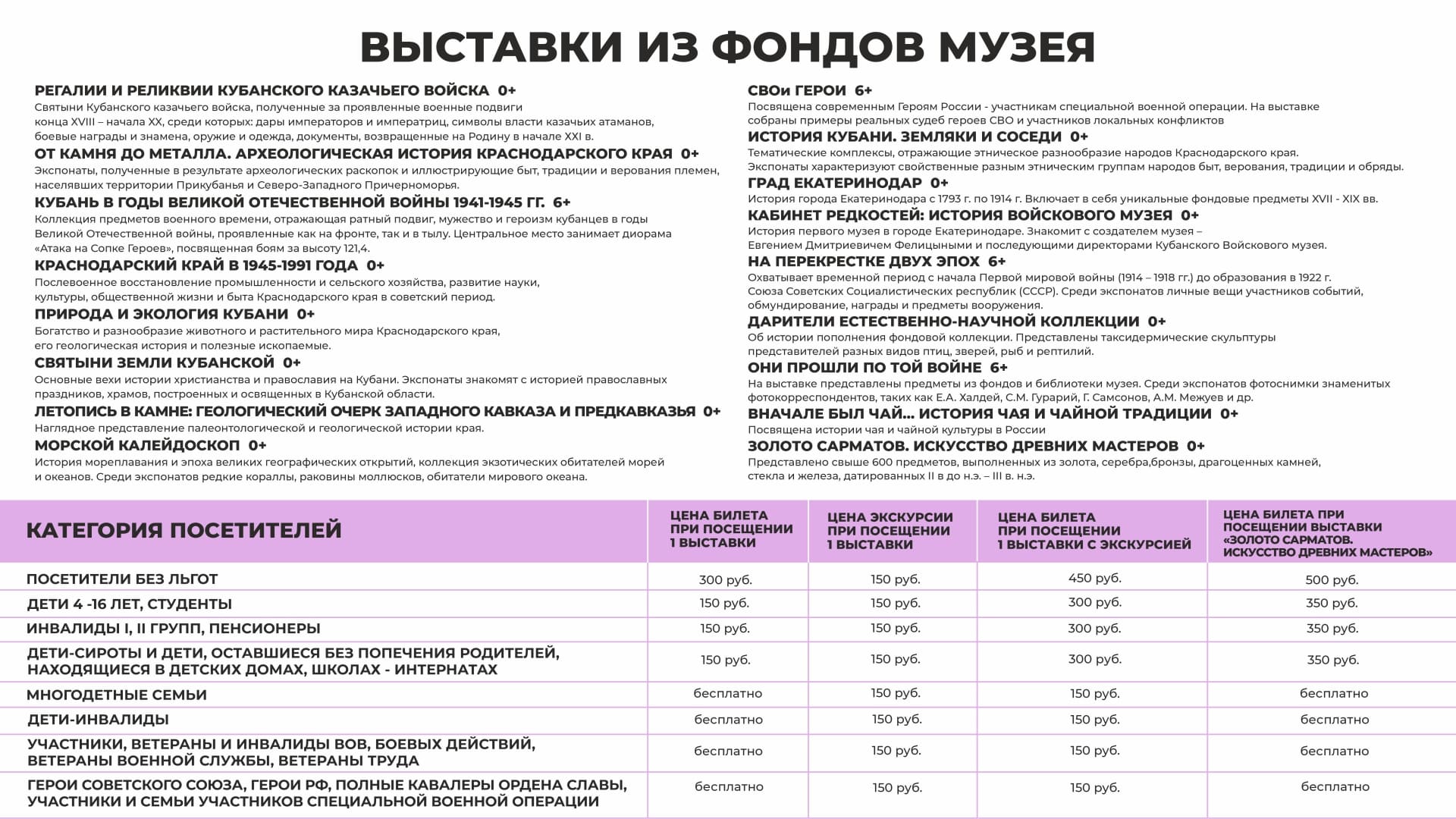 Каждый третий четверг месяца установлено право бесплатного посещения стационарных выставок музея для следующих категорий граждан, при условии предоставления подтверждающих документов: